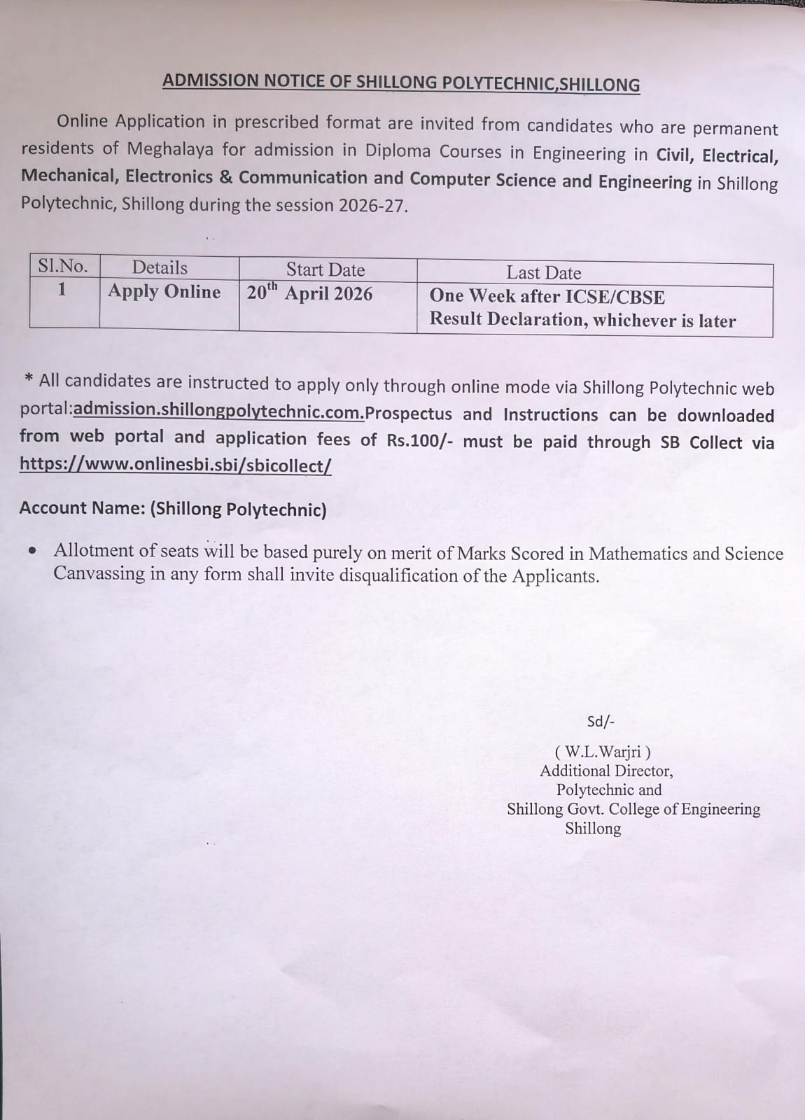 The opening ceremony for the Diamond Jubilee Celebration of Shillong Polytechnic was held on the 10th of April 2026 with great enthusiasm and grandeur. The event marked the beginning of a significant milestone, celebrating sixty years of the institution’s contribution to technical education and development. The ceremony was graced by the esteemed presence of the Chief Guest, Shri Vijay Kumar Mantri, Commissioner of the Education Department, who addressed the gathering and highlighted the importance of technical education in shaping the future of the youth. His speech emphasized innovation, skill development, and the role of institutions like Shillong Polytechnic in nation-building. The Guest of Honor for the occasion was Smti. H. D. B. Sangma, Director of the Directorate of Higher Education. She spoke about the progress of higher education in the region and encouraged students to strive for excellence and make meaningful contributions to society. The ceremony witnessed the presence of faculty members, students, alumni, and distinguished guests. It featured cultural performances, speeches, and reflections on the institution’s journey over the past six decades. The event set a vibrant and celebratory tone for the series of activities planned as part of the Diamond Jubilee celebrations.