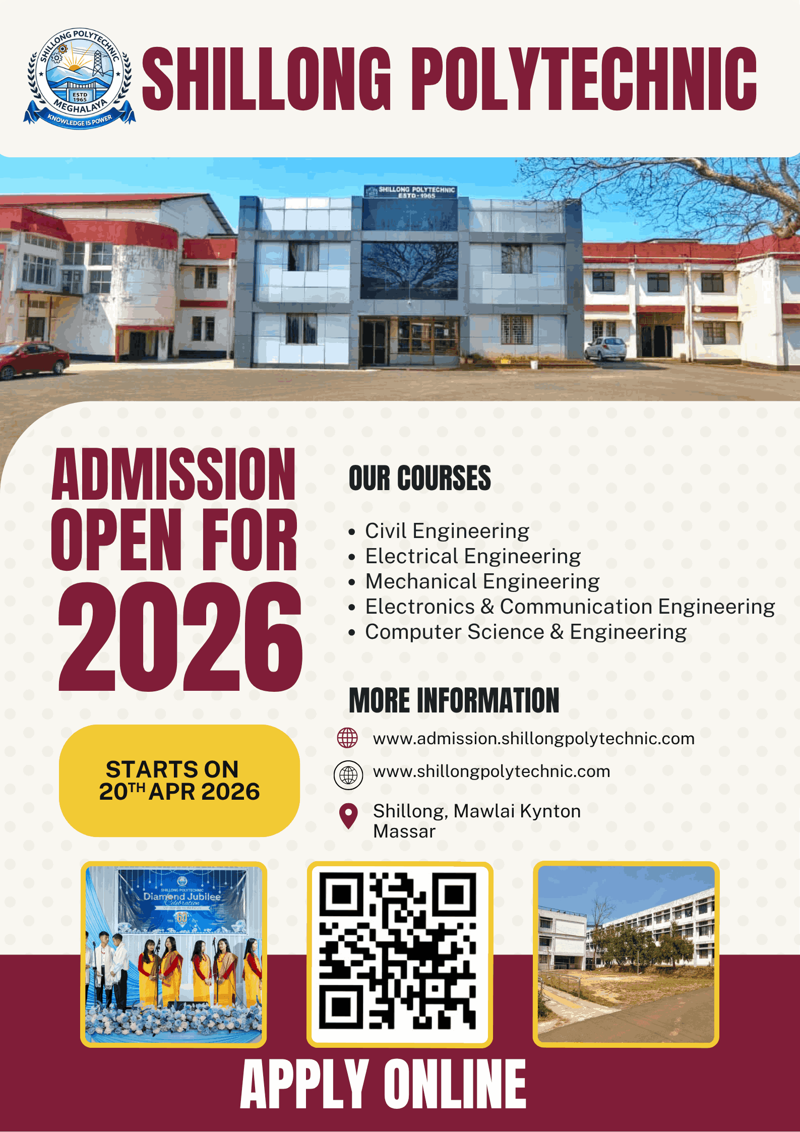 This is to inform all aspiring students that online admissions for Shillong Polytechnic will commence from 20th April 2026.