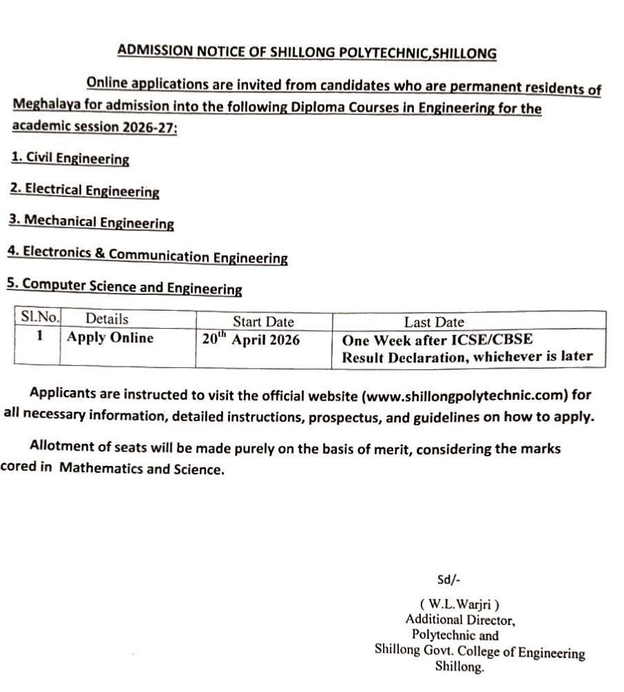This is to inform all aspiring students that online admissions for Shillong Polytechnic will commence from 20th April 2026.